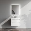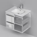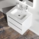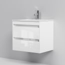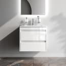 Med dette vegghengte baderomsmøbelet i hvit høyglans får du en kombinasjon av gjennomtenkt design og funksjonell hverdag. Den glatte, hvite overflaten møter grafittfargede detaljer, og sammen gir de et rolig og stilrent uttrykk som løfter hele rommet.