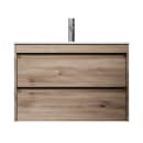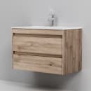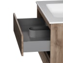 Med dette vegghengte badeværelsesmøbelet i eik får du en gjennomtenkt kombinasjon av funksjon, estetikk og hverdagsvennlig design. Den strukturerte overflaten i trelook og de grafittfargede detaljene gir et elegant uttrykk, mens den veggmonterte konstruksjonen gir rommet et luftig preg og får badet til å føles større.
