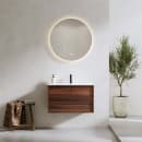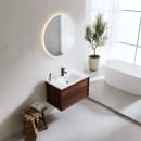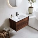 Modellen Bathlife Charm 810 mm, valnøtt har en tynn ramme rundt fronten og integrerte håndtak for et ryddig uttrykk. Den tremønstrede overflaten gir et varmt inntrykk, mens den hvite servanten i porselen er sentrert på skapet. Skuffene er utstyrt med mykstengende mekanisme for stille og skånsom lukking.