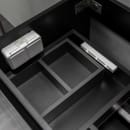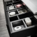 Bathlife Eufori-serien har slette fronter og en halvmatt sort finish som gir et stilrent uttrykk. Skuffene er utstyrt med mykstengende funksjon og har skråstilt øvre kant for enkel åpning. Det er ikke håndtak eller luker på skapet, noe som gir et rent og moderne utseende.