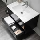 Velg Eufori fra Bathlife når du ønsker et servantskap med halvmatte sorte fronter, porselensvask og praktiske løsninger som belysning og strømuttak.