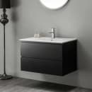 Møbelserien Eufori fra Bathlife gir et stilrent uttrykk med slette fronter i halvmatte sorte MDF-plater. Med en bredde på 800 mm, høyde på 500 mm og dybde på 460 mm får du et servantskap som kombinerer funksjon og design. Vasken er laget i hvit porselen, og skapet leveres ferdigmontert.