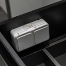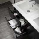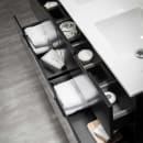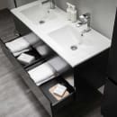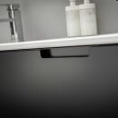 Servantskapet fra Glädje-serien har slette fronter uten håndtak, noe som gir et moderne uttrykk. Den matte svarte finishen på MDF-materialet gir et tidløst preg, mens den doble porselensservanten i hvitt gir en tydelig kontrast. Skuffene er mykstengende for stille og behagelig bruk.