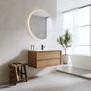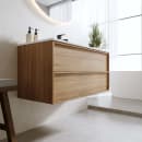 Bathlife Charm i eik har en tynn ramme rundt skapet og integrerte gripekanter på skuffene. Overflaten har et tydelig tremønster som gir et varmt uttrykk. Skuffene er myktlukkende for en stille og behagelig bruk.