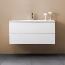 Servantskapet har slette fronter uten håndtak, og den skråstilte øvre kanten gjør det enkelt å åpne skuffene. De to skuffene gir deg smart oppbevaring, og myktlukkende funksjon gir en stille og behagelig bruk.