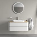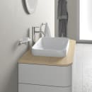 Servanten kan kombineres med ulike servantskap og benkeplater fra Duravit. I skapene kan du velge interiørsystem i lys lønn eller brun massiv valnøtt, og det er mulig å få innvendig LED-belysning i skuffen. Tilleggsprodukter til servanten finnes under tilbehør.