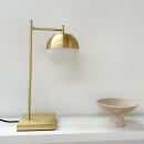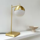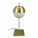 Bordlampe i børstet messing med glasskuppel. Sort stoffledning på 1,6 m med av/på-bryter. Lampen måler L25 cm x H45 cm. E14 maks 18 W. 230 V, 50 Hz. Pære ikke inkludert.