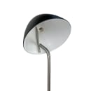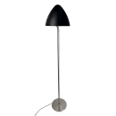 Gulvlampe med metallskjerm og overflate i børstet stål. Skjermen kan vippes og roteres. Slås av og på med ledningen.