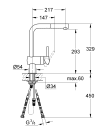 Minta kjøkkenarmatur fra GROHE kombinerer funksjonelt design med praktiske løsninger. Med en høy L-formet tut som kan svinges 360°, får du fleksibilitet til å rengjøre vasken eller fylle store kjeler. Den uttrekkbare dusjen gir ekstra rekkevidde, og armaturet har en maksimal vannmengde på 10 liter per minutt ved 3 bar.