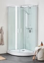 Dusjkabinettet er laget med 5 mm herdet sikkerhetsglass og bakvegger i frostet glass, noe som gir både stil og beskyttelse. Den matt sølv finishen på profilene og håndtakene i aluminium bidrar til et moderne uttrykk. Det lave dusjkar i sanitetsakryl (115 mm) har en rustfri sveiset stativ og en avtagbar front, noe som gjør installation og vedlikehold enklere.