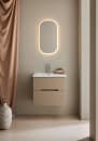 Skapet har en matt overflate i beige og leveres med en enkel servant i hvitt porselen. Den store kroken på servanten gir ekstra plass til oppbevaring både på sidene og bak. Det integrerte håndtaket har en myk avrunding som gjør det behagelig å bruke.