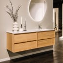 Home servantskap fra Korsbakken Bad gir deg et baderomsmøbel i nordisk stil, med rene linjer og gjennomtenkte detaljer. Skapet har en bredde på 1190 mm, høyde på 500 mm og dybde på 457 mm. De integrerte håndtakene i heltre eik og overflater i eikefiner gir et helhetlig uttrykk.